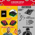 Easy-cleaning fabric popup board, foam fabric discs, and golf balls.